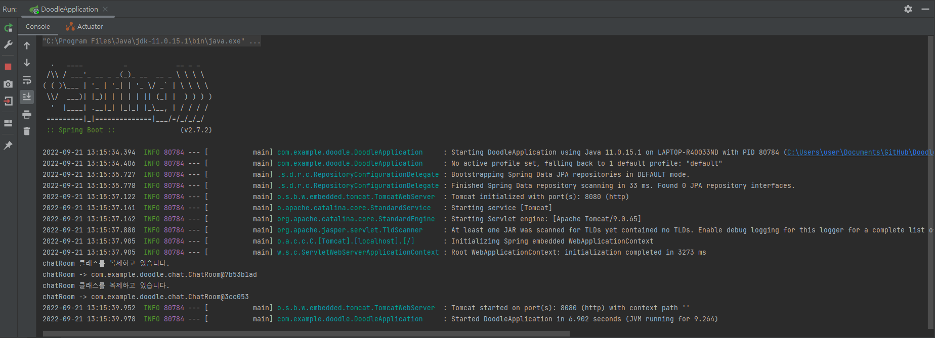 프로젝트를 실행하면 현재의 port number를 확인할 수 있다. 톰캣으로 인해 8080 포트를 사용하고 있다.