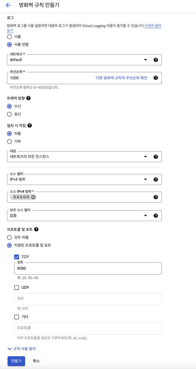 들어가면 default-allow-... 이런식으로 기본적인 내용들만 작성이 되어있기 때문에 우리가 원하는 포트로 접근할 수 있도록 방화벽을 구성하는 규칙을 만들어야함